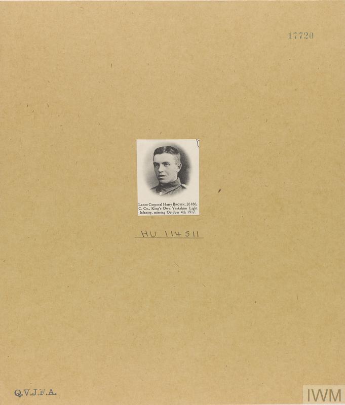 Lance Corporal Harry Brown 26186. Unit: C Company, 10th Battalion, King's Own Yorkshire Light Infantry. Death: 04 October 1917 Western Front. Son of Harry and Ann Elizabeth Brown, of 53, Abbeydale Rd., Sheffield.