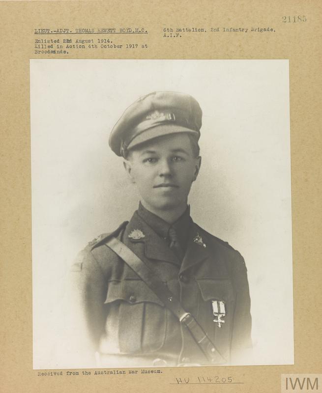Lieutenant Thomas Hewett Boyd MC. Unit: 6th Battalion, 2nd Infantry Brigade, Australian Infantry, Australian Imperial Force. Death: 04 October 1917 Broodseinde Western Front