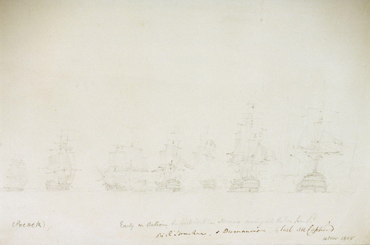 Early in Action. English - - - Namur coming into the line from Sd. Sir R Strachan & Dumanoir 4 Sail All Captured. original art: drawing