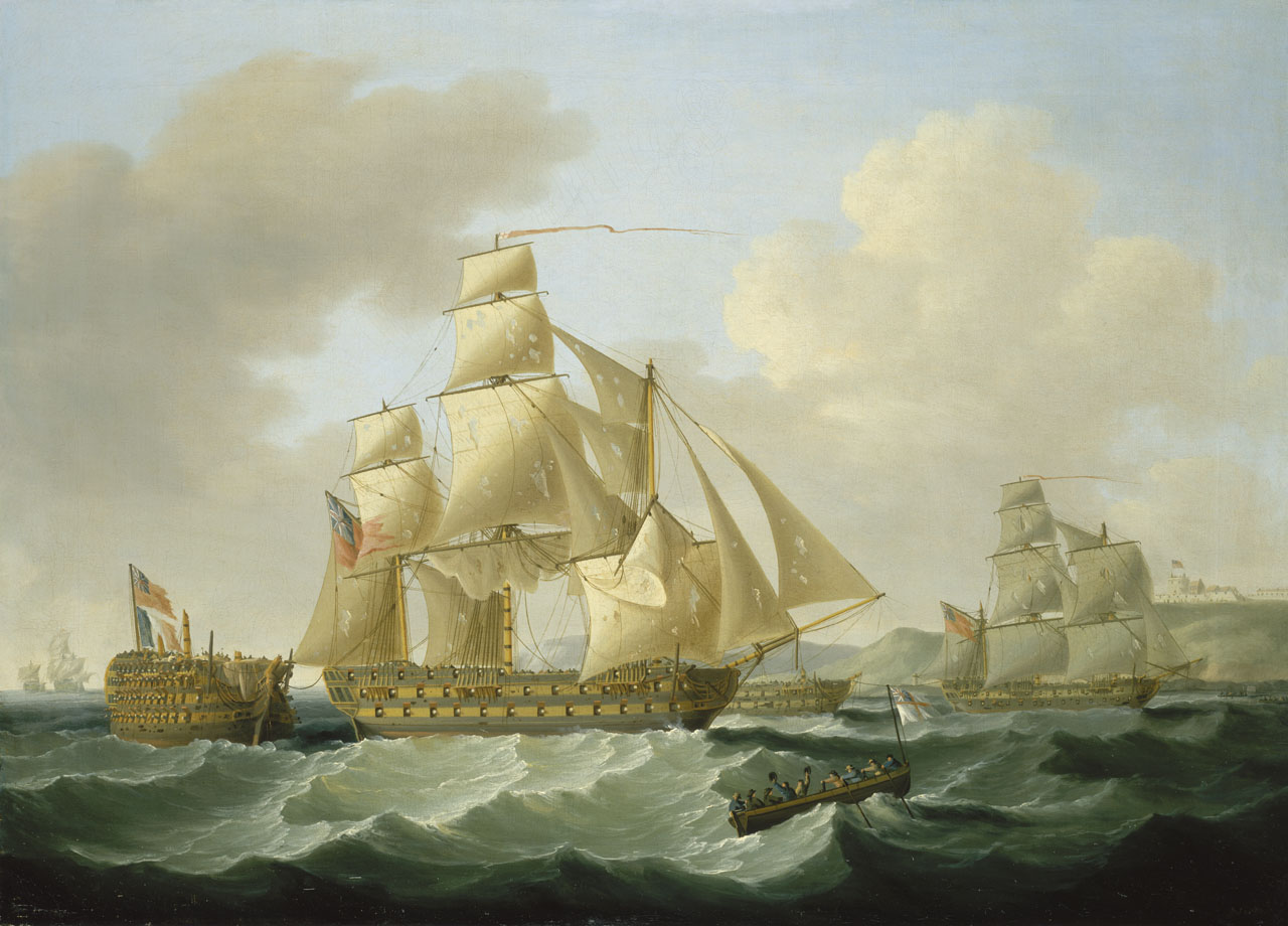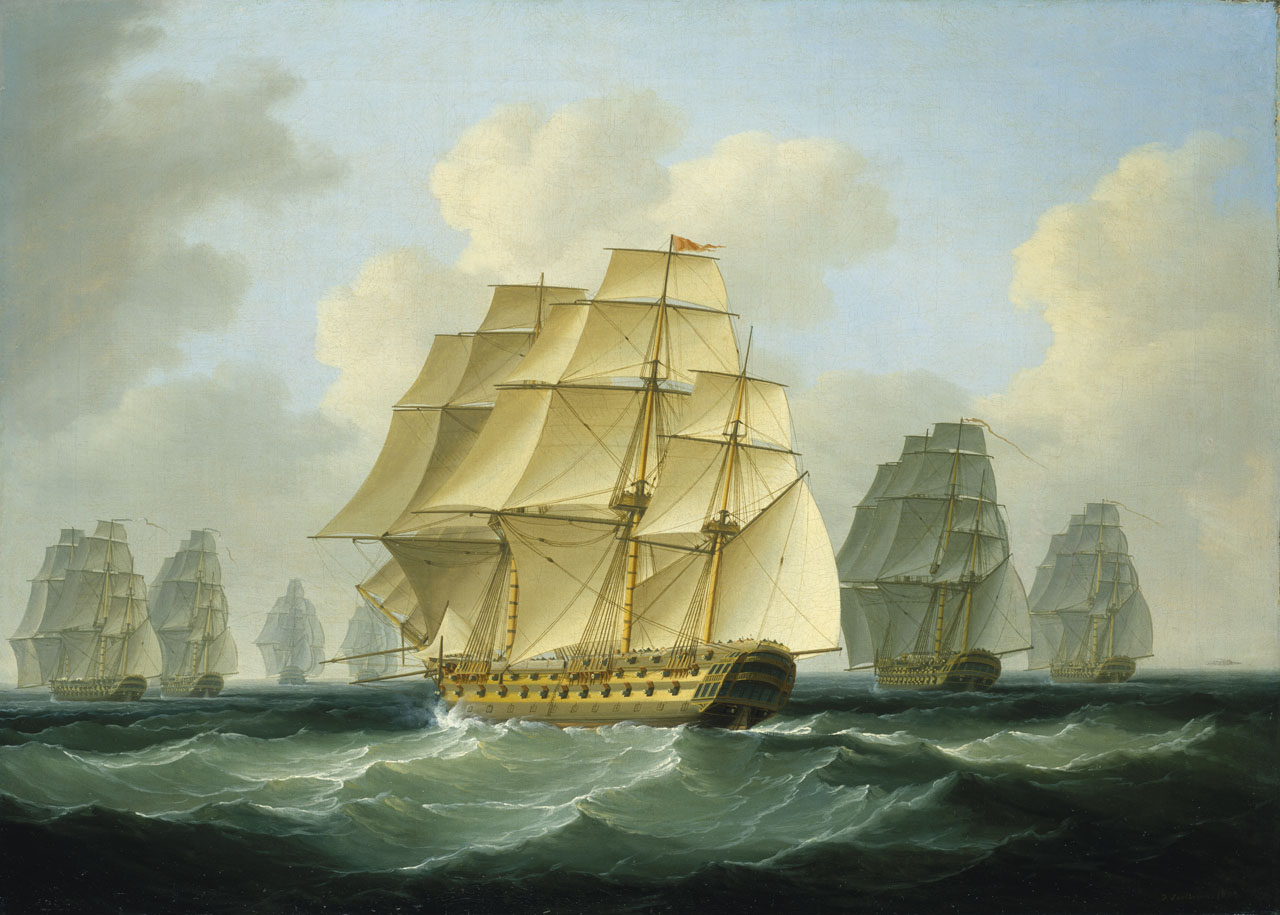 Strachan's Action after Trafalgar, 4 November 1805: Bringing Home the Prizes. One of a pair of paintings showing an incident from the Napoleonic Wars 1803-15. After their defeat at Trafalgar in 1805, the remnants of the Franco-Spanish fleet dispersed