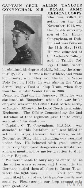 Captain Cecil Allan Taylor Conyngham MB. Unit: Royal Army Medical Corps. Death: 04 November 1914 Killed in action at Tanga German East Africa (modern Tanzania).