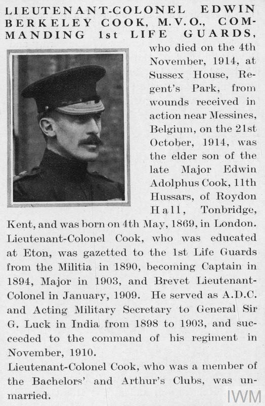 Lieutenant Colonel Edwin Berkeley Cook MVO. Unit: Commanding Officer, 1st Life Guards. Death: 04 November 1914 Wounded near Messines on the 21 October 1914 Died of wounds in London Western Front