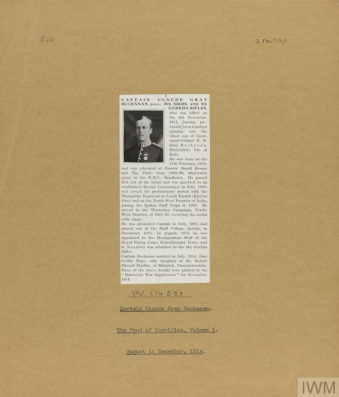 Captain Claude Gray Buchanan. Unit: 35th Sikhs, attached to 2nd Battalion, 8th Gurkha Rifles, Indian Army. Death: 04 November 1914 Western Front