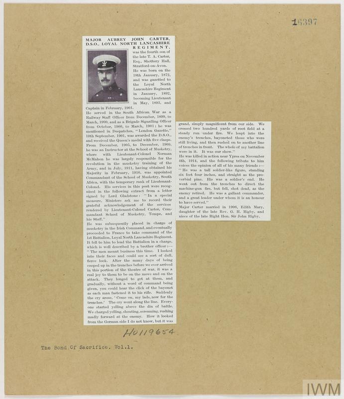 Major Aubrey John Carter DSO MID. Unit: Commanding 1st Battalion, Loyal North Lancashire Regiment. Death: 04 November 1914 Killed in action near Ypres Western Front