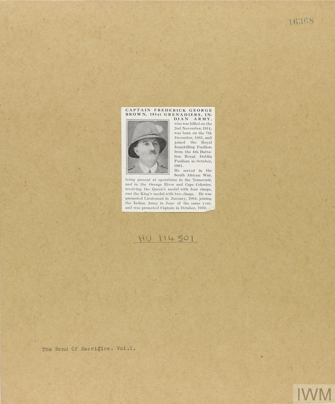 Captain Frederick George Brown. Unit: 101st Indian Grenadiers, Indian Army. Death: 04 November 1914 Tanzania