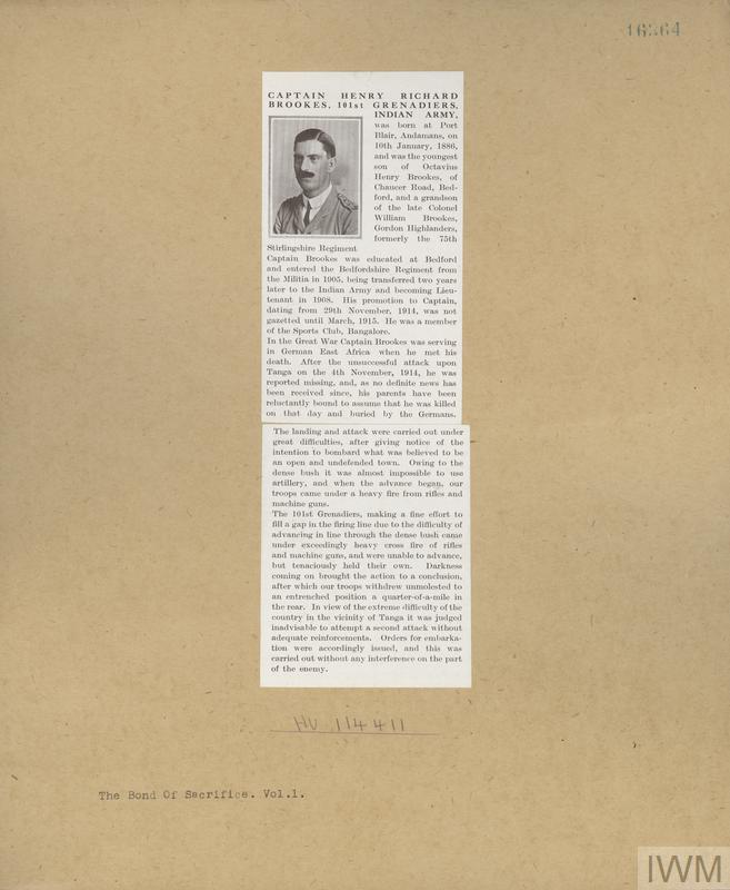 Captain Henry Richard Brookes. Unit: 101st Grenadiers, Indian Army. Death: 04 November 1914 Tanga East Africa