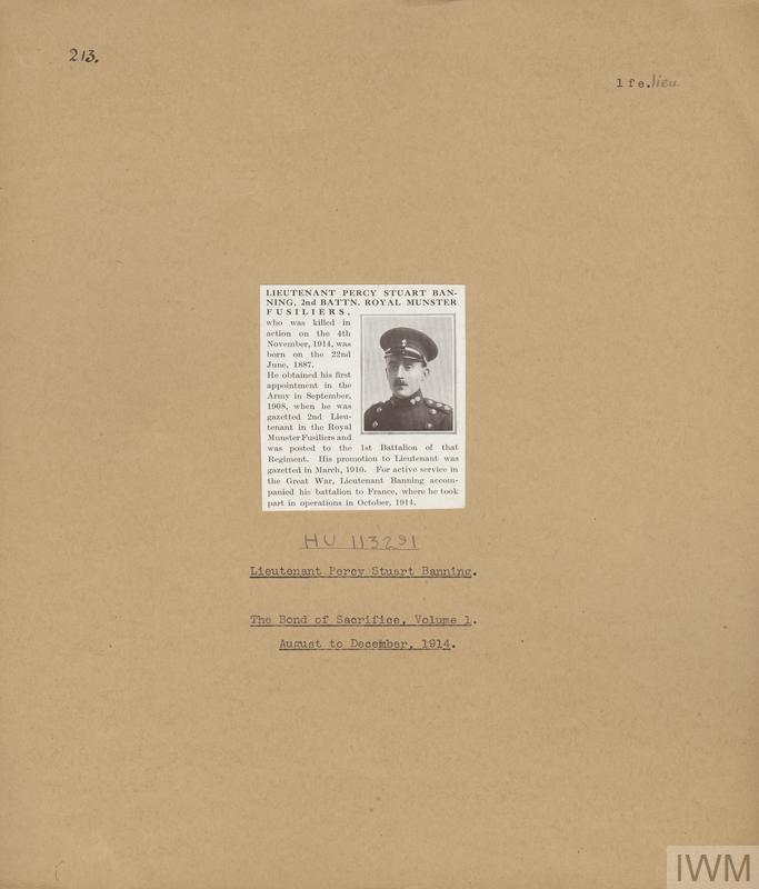 Lieutenant Percy Stuart Banning. Unit: 2nd Battalion, Royal Munster Fusiliers. Death: 04 November 1914