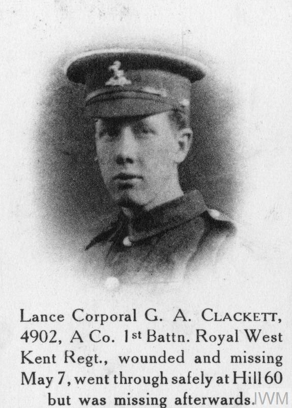 Lance Corporal George Arthur Alexander Clackett G/4902. Unit: A Company, 1st Battalion, Royal West Kent Regiment. Death: 05 May 1915 Wounded and Missing in action Western Front