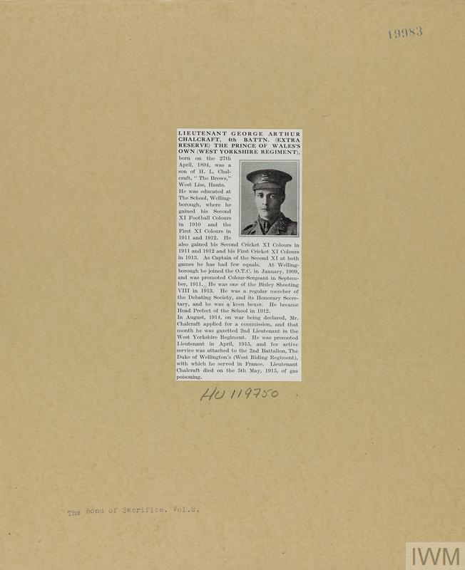 Lieutenant George Arthur Chalcraft. Unit: 4th Battalion, West Yorkshire Regiment, attached to 2nd Battalion, Duke of Wellington's (West Riding Regiment). Death: 05 May 1915 Died of gas poisoning Western Front