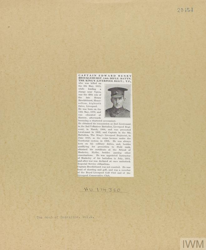 Captain Edward Henry Brocklehurst. Unit: 1st/6th Battalion, The King's (Liverpool Regiment). Death: 05 May 1915 Ypres Western Front