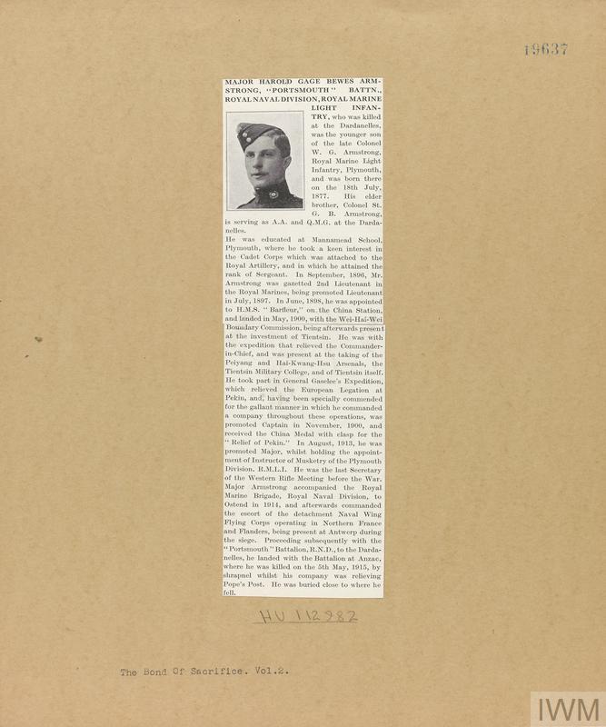 Major Harold Gage Bewes Armstrong MID. Unit: Portsmouth Battalion, Royal Naval Division, Royal Marine Light Infantry. Death: 05 May 1915 Pope's Post Dardanelles