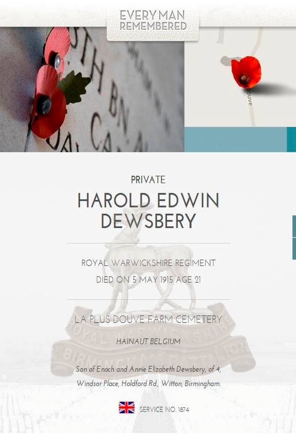 Private Harold Edwin Dewsbery 1874, Royal Warwickshire Regiment