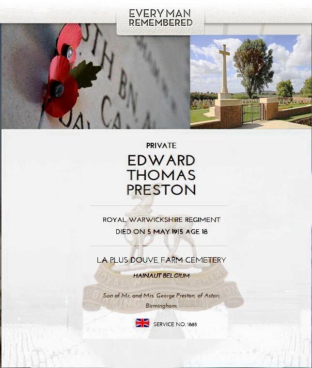Private Edward Thomas Preston 1885, Royal Warwickshire Regiment