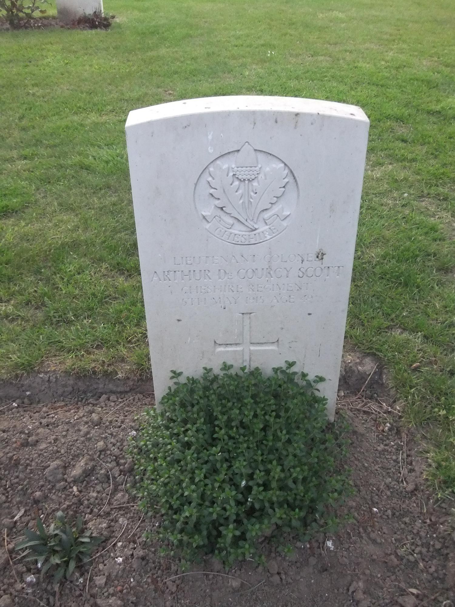 Lieutenant Colonel Arthur De Courcy Scott. Unit: 1st Battalion, Cheshire Regiment. Death: 05 May 1915 Killed in action near Zillebecke Western Front.