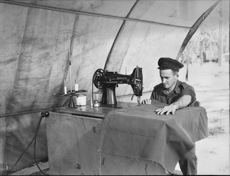 Craftsman A R Bennett uses a Singer sewing machine to make canvas bags