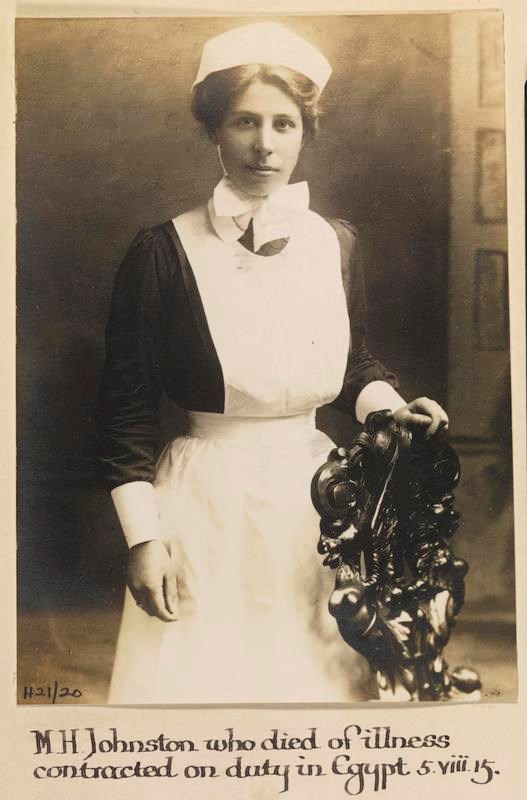 Miss Margaret H Johnston, Queen Alexandra's Imperial Military Nursing Service Reserve. Died of illness contracted on duty in Egypt 05 September 1915.
