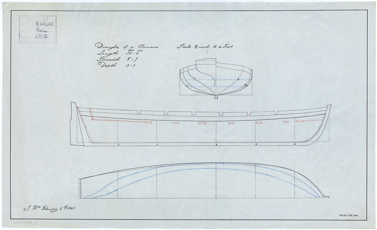 30 ft Pinnace. Scale: 1:24. Plan showing the body plan, profile, and longitudinal half-breadth for a 12-oared 30 ft Pinnace. This is the original plan from which ZAZ7198.3 was traced in 1951, and ZAZ7198.1 and ZAZ7198.2 are dyeline copies of the tracin
