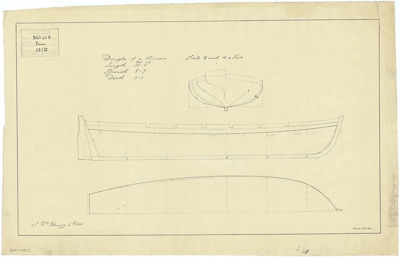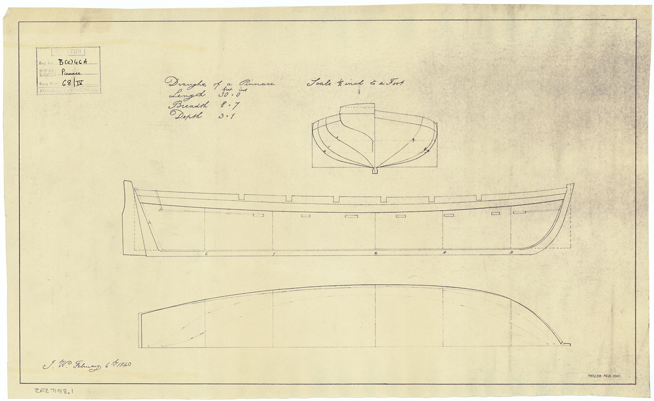 30 ft Pinnace. Scale: 1:24. Plan showing the body plan, profile, and longitudinal half-breadth for a 12-oared 30 ft Pinnace. Two paper dyeline copies made from this tracing: ZAZ7198.1 and ZAZ7198.2. The plan was traced from an original, reference ZAZ71