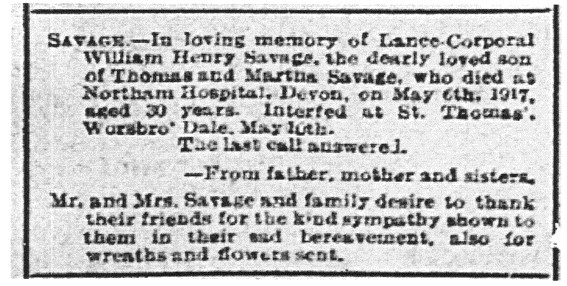 Private William H Savage 13/1296, York and Lancaster Regiment