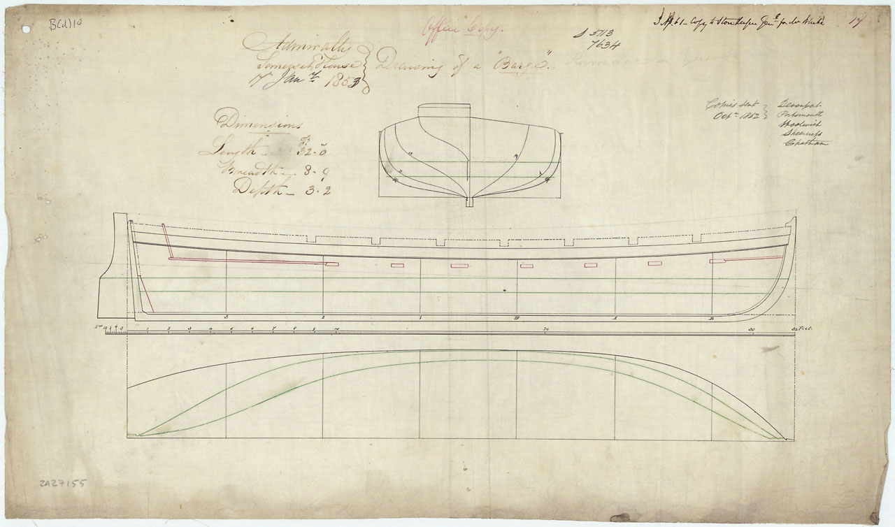 32 ft Barge. Scale: 1:24. Plan showing the body plan, sheer lines with some inboard detail, longitudinal half-breadth for a 14-oared 32 ft Barge. Annotation dated October 1852, listing the dockyards to which copied were sent.