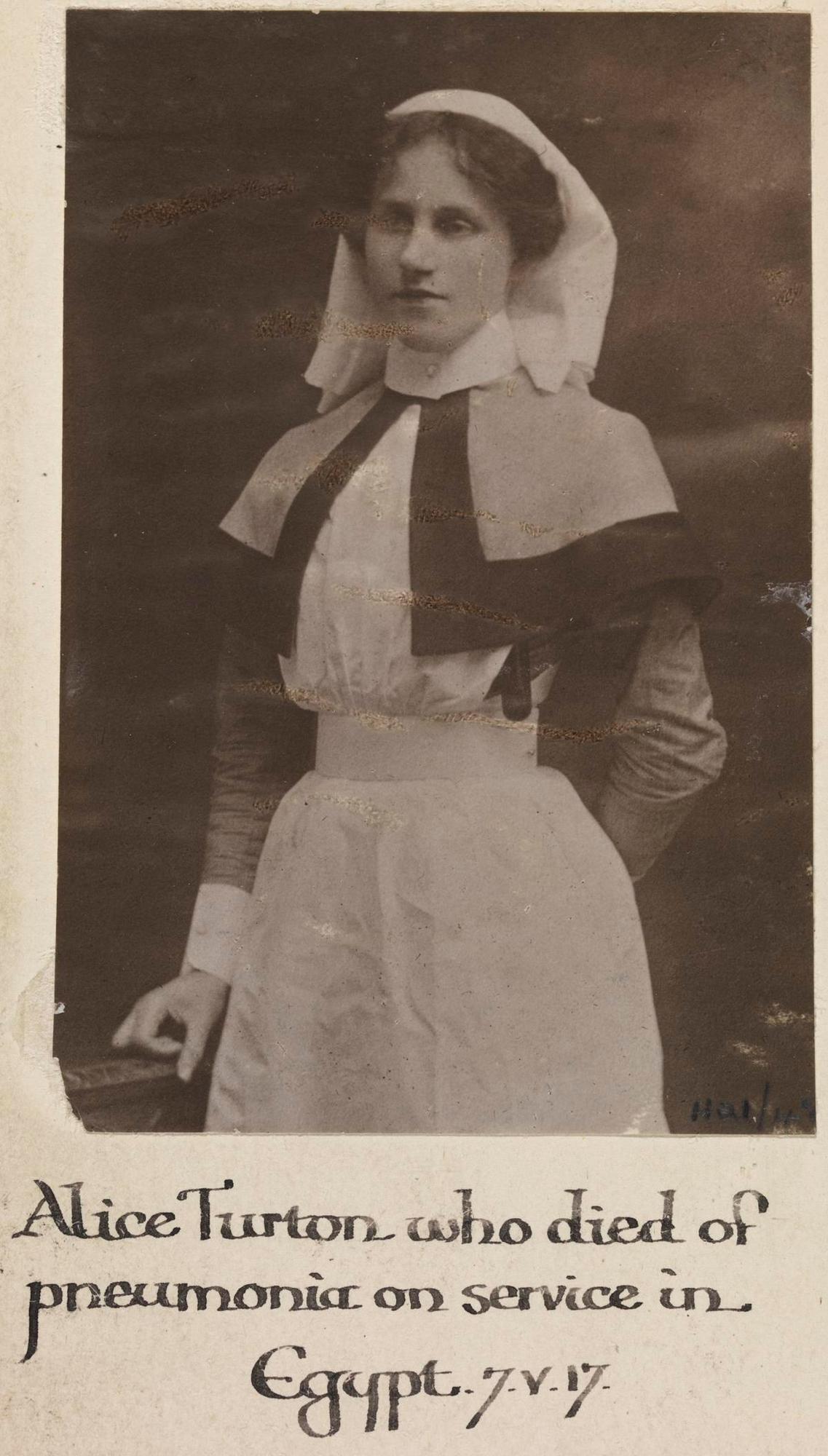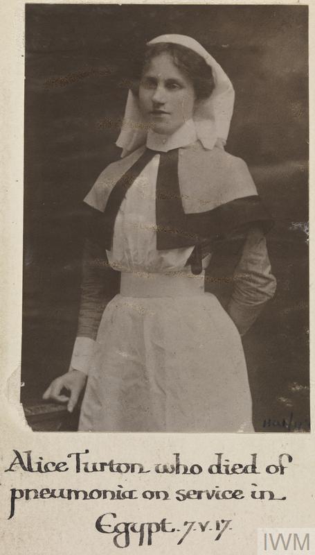 Staff Nurse Alice Turton, Queen Alexandra's Imperial Military Nursing Service Reserve. Died of pneumonia contracted on duty 07 May 1917.