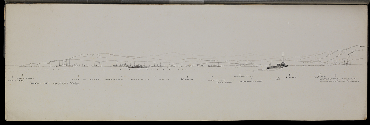 No 29 in a series of sketches of the Dardanelles/Gallipoli Campaign 1915 showing named British ships and landmarks, Suvla Bay, Aug 7th 1915. Signed by artist and dated.