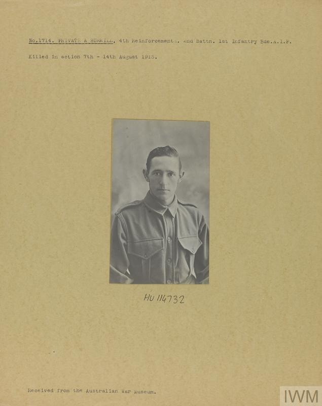 Private Arthur Burrill 1714. Unit: 4th Reinforcements, 2nd Battalion, 1st Infantry Bridgade, Australian Imperial Force. Death: 07 August 1915 to 14 August 1915 Western Front