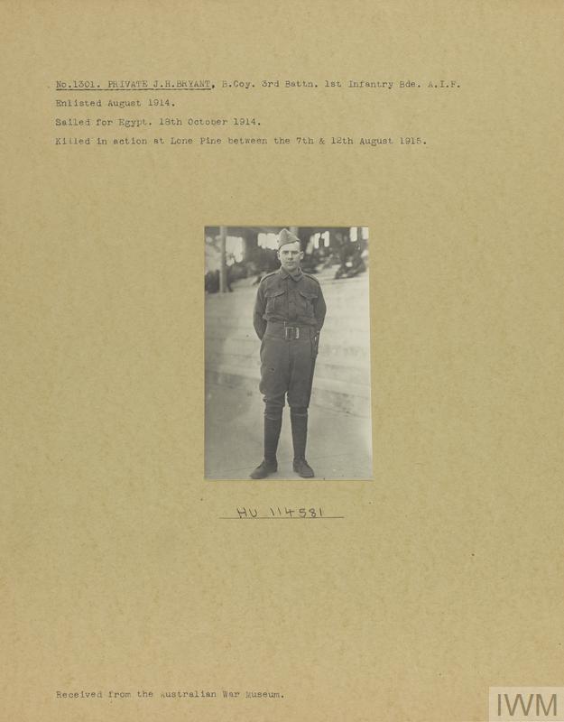 Private James Henry Bryant 1301. Unit: B Company, 3rd Battalion, 1st Infantry Brigade, Australian Infantry, Australian Imperial Force. Death: 07 August 1915 to 12 August 1915 Lone Pine Dardanelles