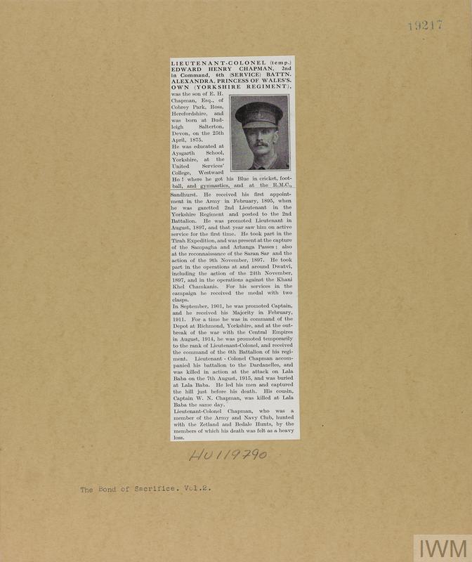 Lieutenant Colonel (Temporary) Edward Henry Chapman. Unit: 6th Battalion, Yorkshire Regiment. Death: 07 August 1915 Killed in action Lala Baba, Dardanelles