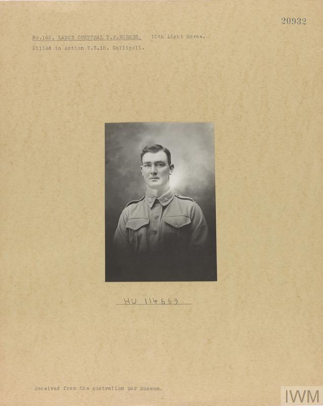 Lance Corporal Thomas Francis Burges 165. Unit: 10th Light Horse Regiment, Australian Imperial Force. Death: 07 August 1915 Gallipoli Dardanelles
