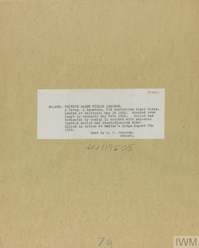 Private James Pullar Cameron 686. Unit: A Squadron, 8th Light Horse Regiment, Australian Imperial Force. Death: 07 August 1917 Killed in action Walkers Walters Ridge Gallipoli