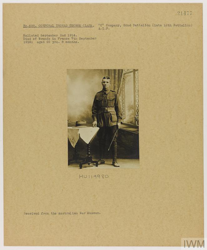 Corporal Thomas George Clark 698. Unit: C Company, 52nd Battalion (late 12th Battalion), Australian Imperial Force. Death: 07 September 1917 Died of wounds aged 22 years Western Front