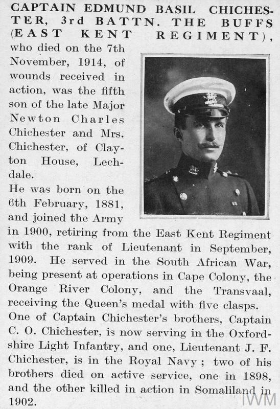Captain Edmund Basil Chichester. Unit: 3rd Battalion, attached to 1st Battalion, The Buffs (East Kent Regiment). Death: 07 November 1914 Died of wounds Western Front. Son of Maj. and Mrs. Newton Chichester.