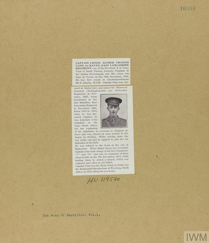 Captain Lionel Alfred Francis Cane. Unit: 1st Battalion, East Lancashire Regiment. Death: 07 November 1914 Killed in action Western Front