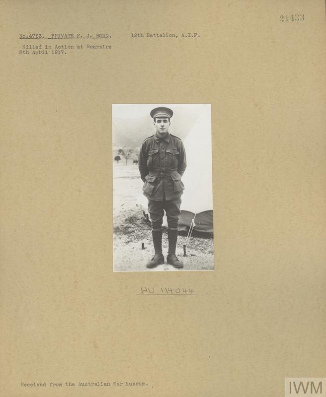 Private Francis John Bond 4763. Unit: 12th Battalion, Australian Imperial Force. Death: 08 April 1917 Boursirs Western Front. Son of Richard and Rose Bond, of Ranelagh, Huon, Tasmania.