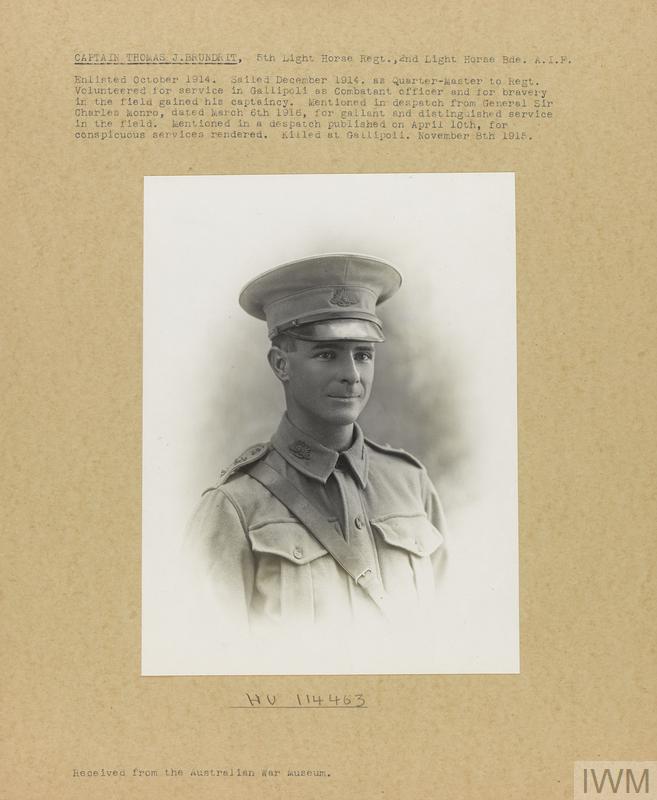 Captain Thomas James Brundrit. Unit: 5th Australian Light Horse Regiment, 2nd Light Horse Brigade, Australian Imperial Force. Death: 08 November 1915 Gallipoli Dardanelles. Son of William and Catherine Brundrit. Native of Brisbane, Queensland.