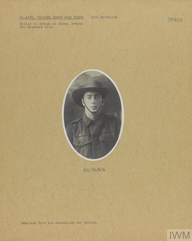 Private Edwin John Byrne 4780. Unit: 18th Battalion, Australian Infantry, Australian Imperial Force. Death: 8 November 1916, killed in action at Flers, Somme, Western Front.