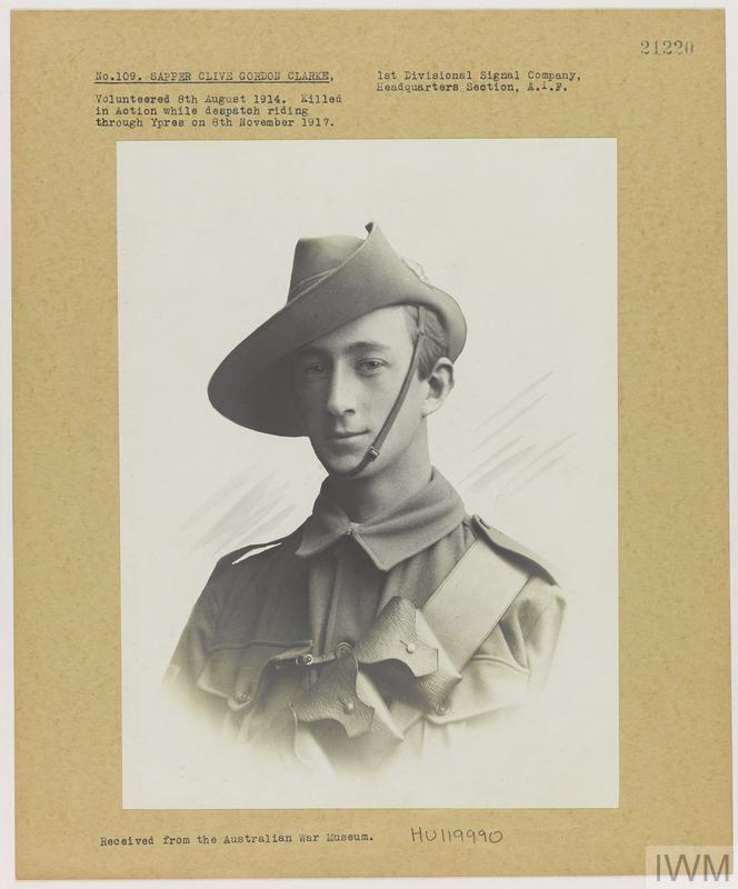 Sapper Clive Gordon Clarke 109. Unit: 1st Divisional Signal Company, Headquarters Section, Australian Imperial Force. Death: 08 November 1917 Killed in action while dispatch riding through Ypres Western Front
