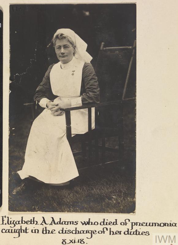 Sister Elizabeth A Adams, Joint War Committee. Died of pneumonia contracted on duty 08 November 1918.