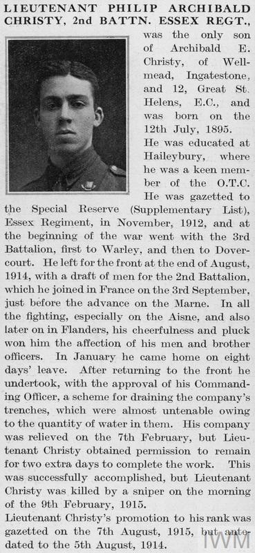 Lieutenant Philip Archibald Christy. Unit: 2nd Battalion, Essex Regiment. Death: 09 February 1915 Killed in action Western Front. Son of Archibald E. Christy, of Wellmead, Ingatestone, Essex.