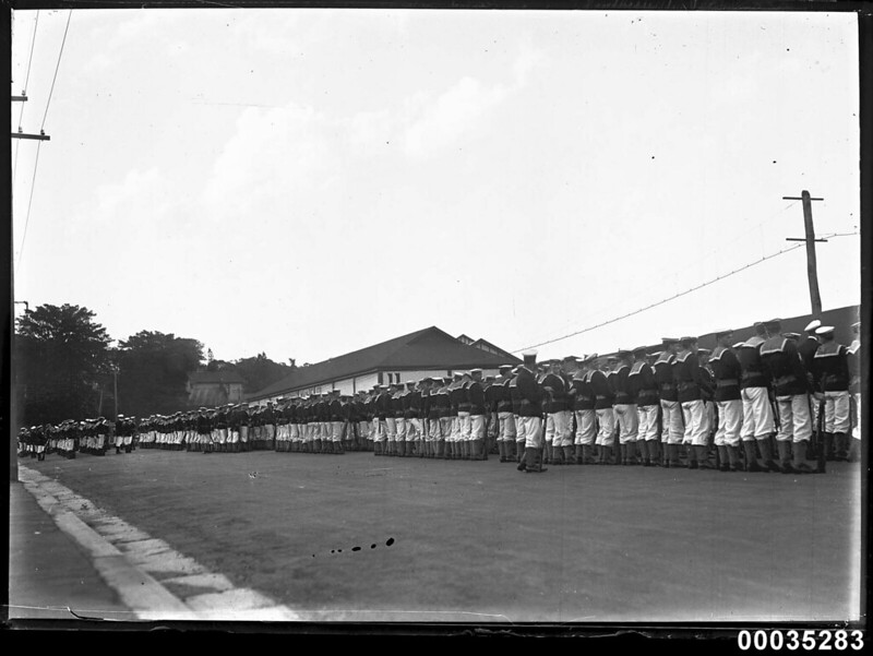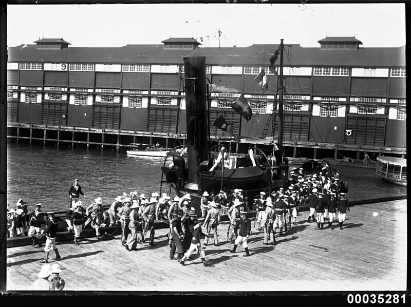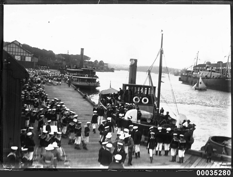 Royal Navy sailors and officers disembark from a tug at Woolloomooloo Bay in Sydney