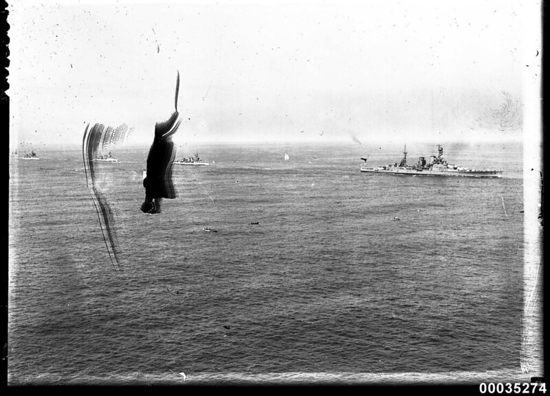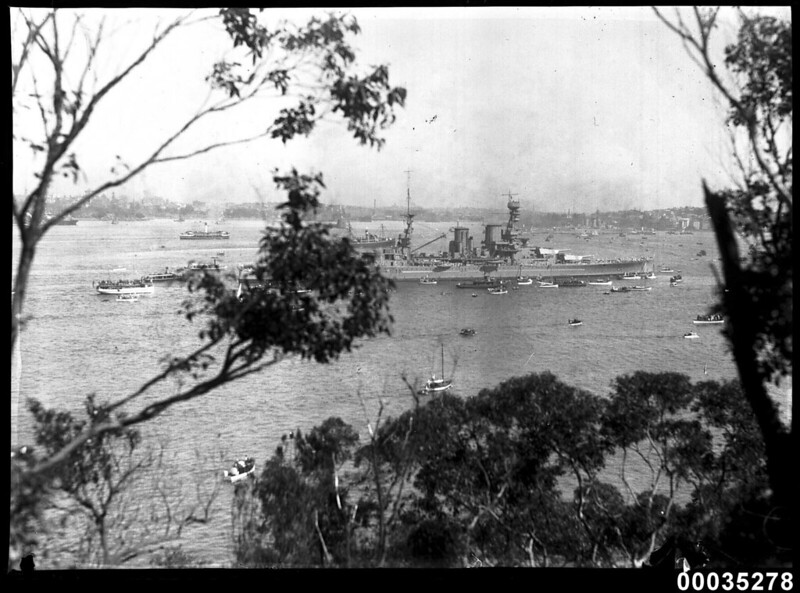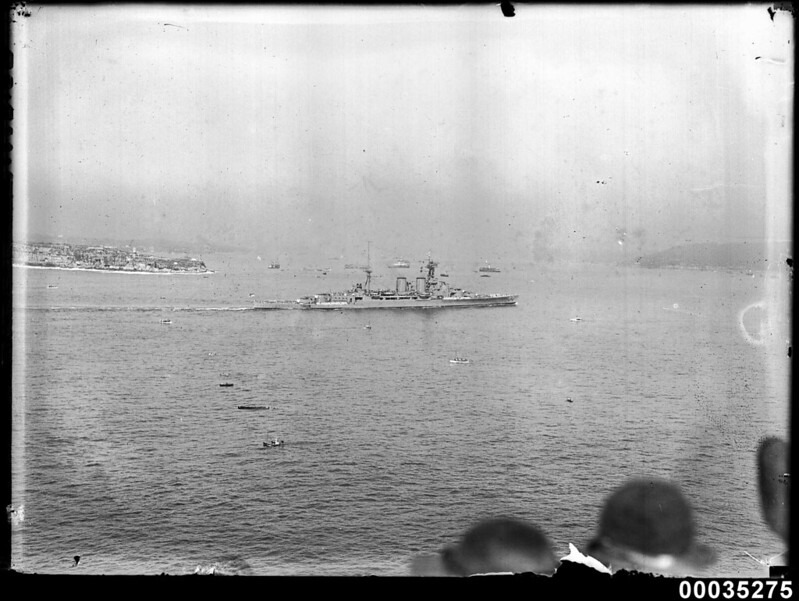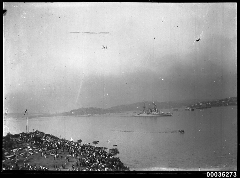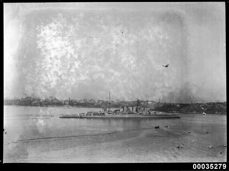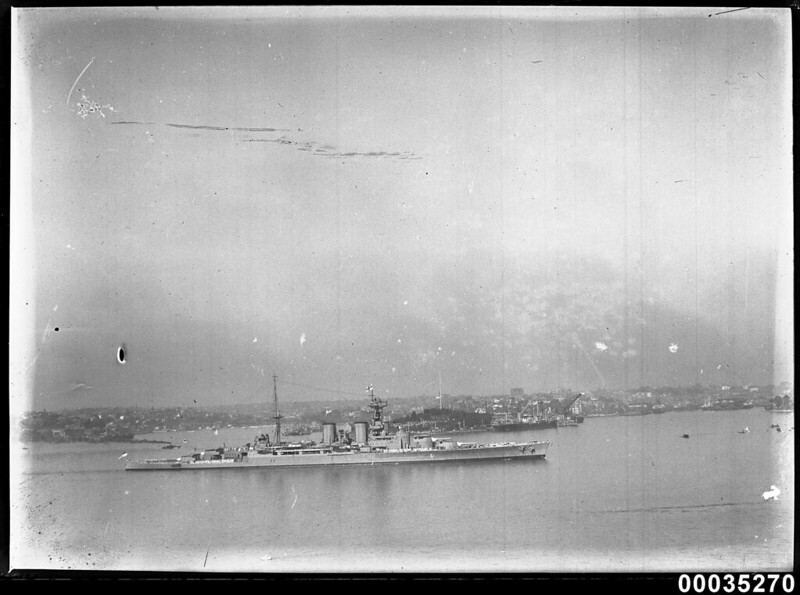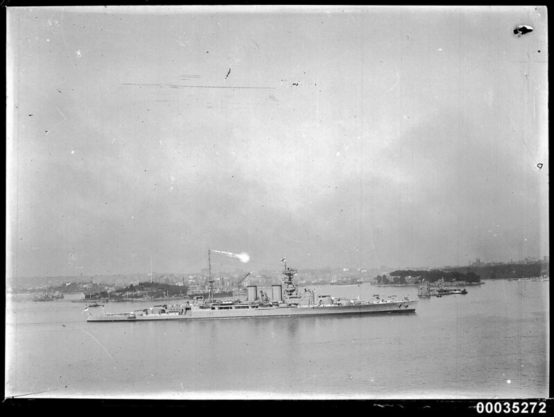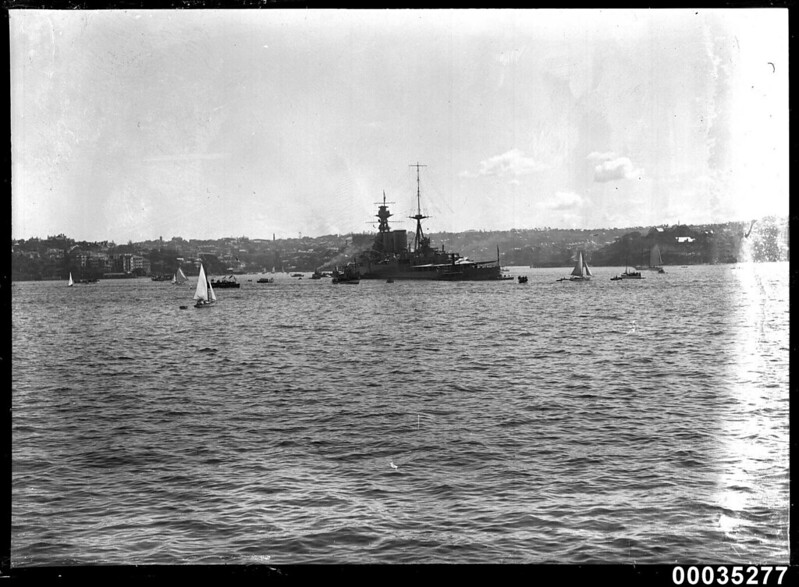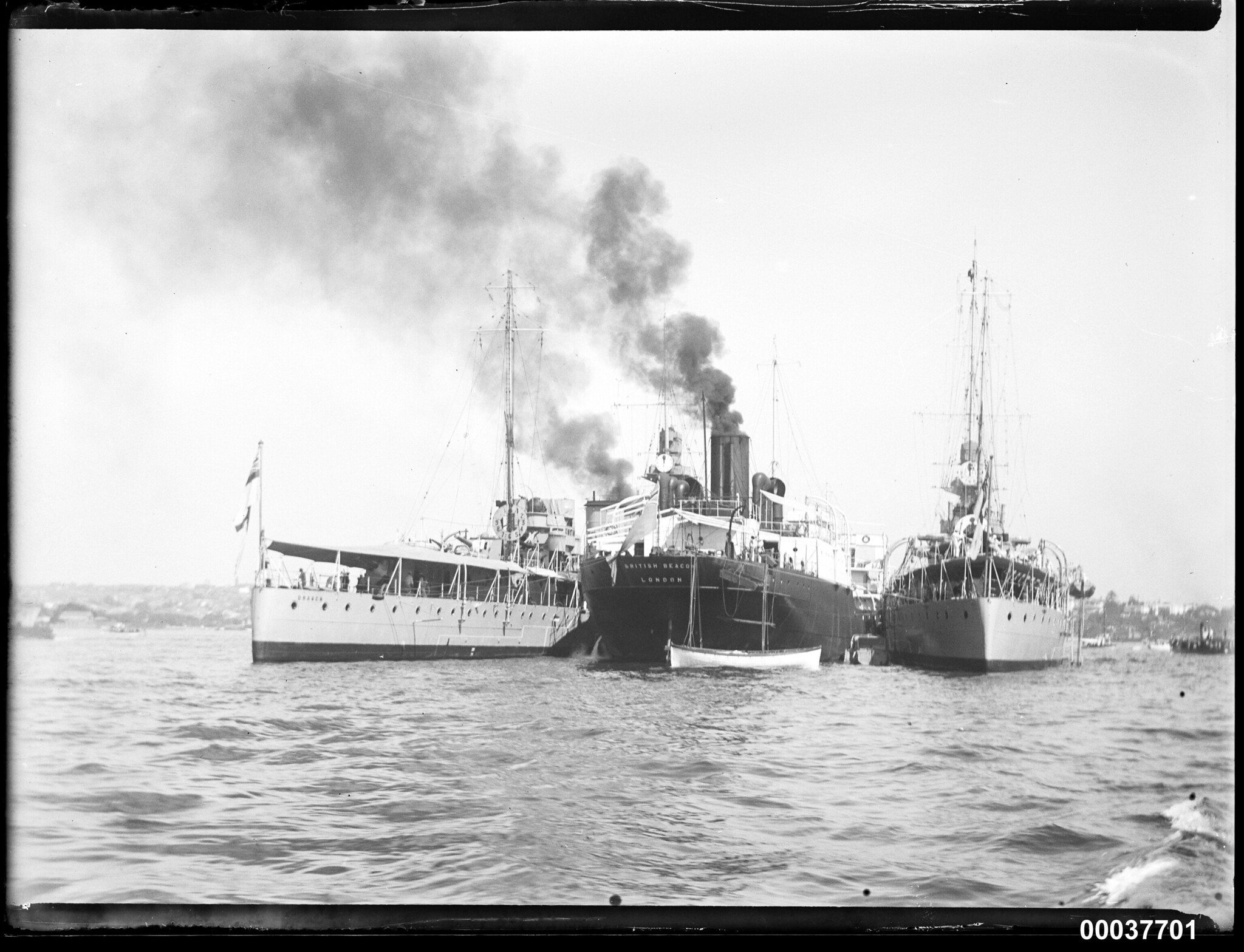 HMS DRAGON, BRITISH BEACON and HMS DUNEDIN anchored off Garden Island