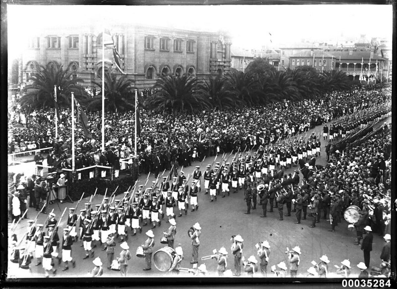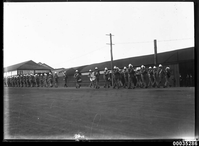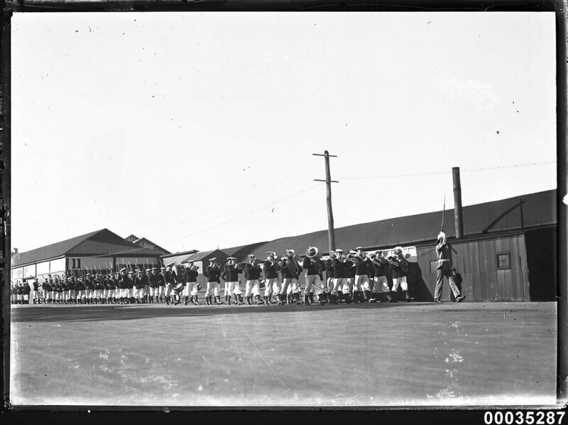 Royal Navy ratings marching with the Royal Marines Band Service marching in Sydney