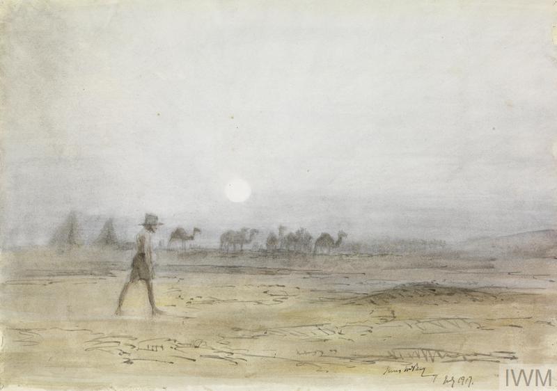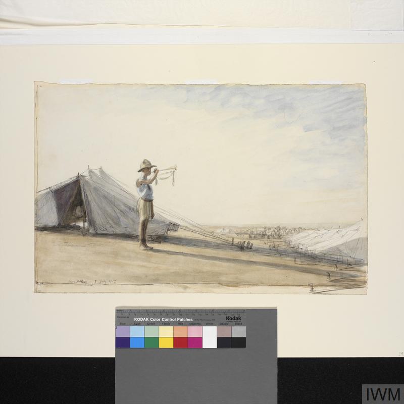 Reveillé : the tents of the Imperial Camel Corps. The Australian trumpeter wakes the sleeping camp