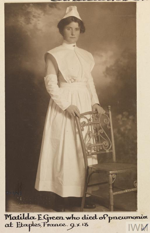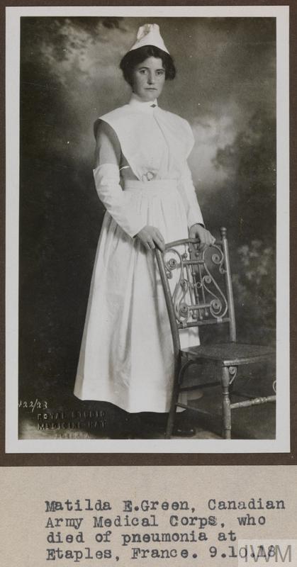 Matilda E Green, Canadian Army Medical Corps. Died of pneumonia in Etaples 09 October 1918.