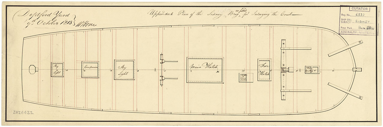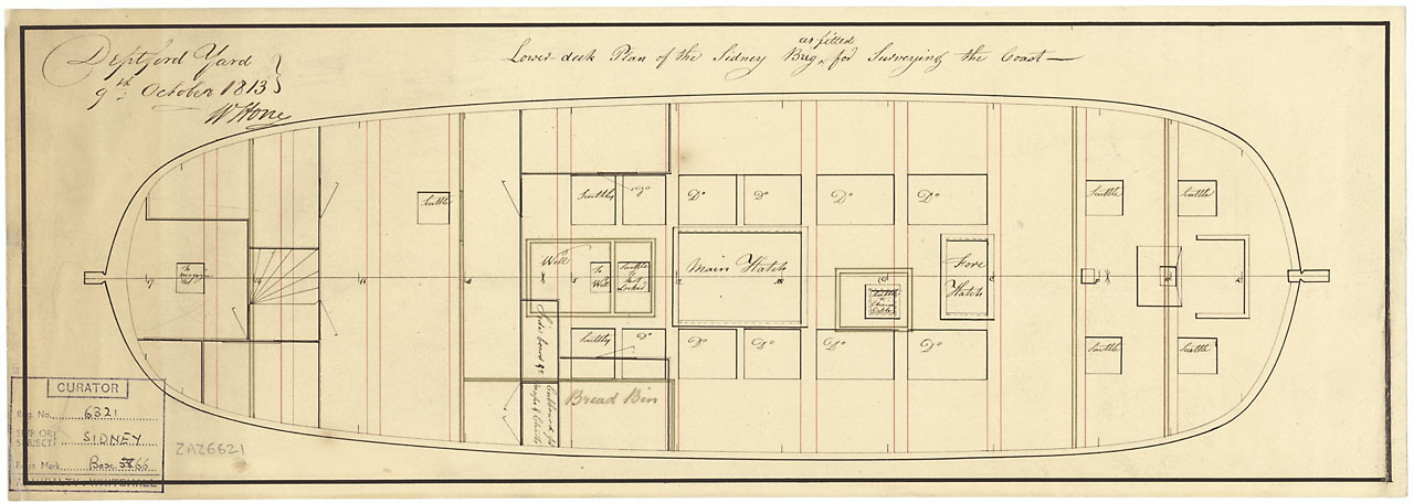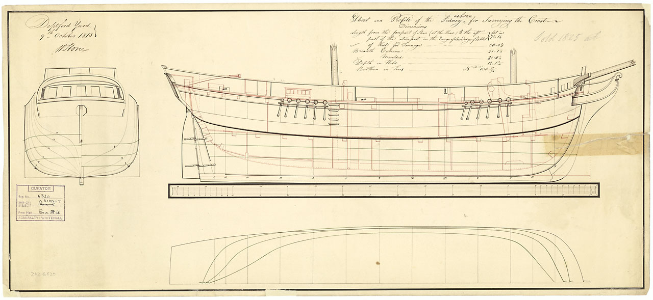 Sidney (1813). Scale: 1:48. Plan showing the body plan with satern board outline, sheer lines with inboard detail and longitudinal half-breadth for Sidney (1813), a 6-gun Brig, as fitted for Surveying. Signed William Stone [Master Shipwright, Deptford D