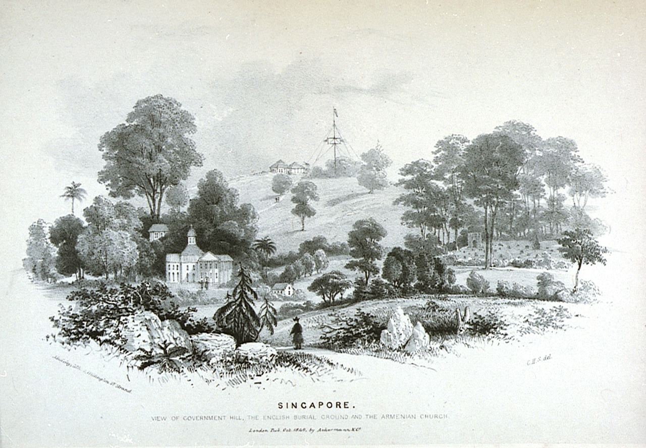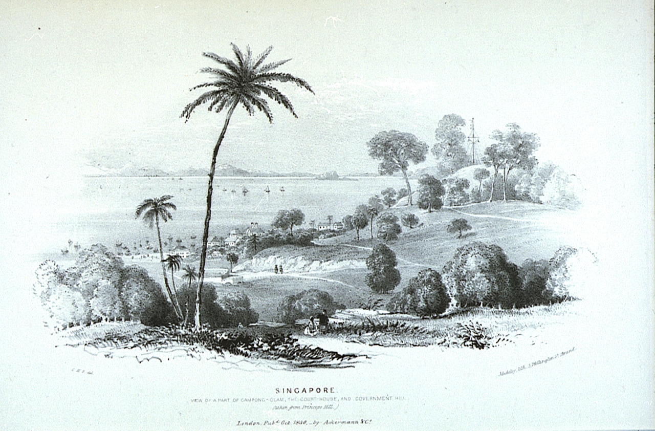 Singapore, view of a part of Campong-Clam, the Court-House, and Government Hill (taken from Princeps Hill). Second illustration in pamphlet Six views of Singapore and Macao from drawings made on the spot in 1840. Bound in pamphlet with PAD0060, PAD0062-PA