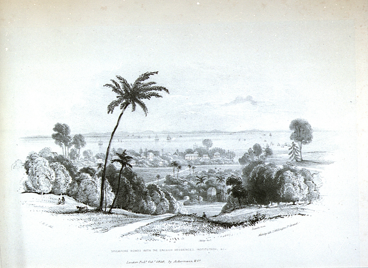 Singapore Roads with the English residences, institution, etc. Third illustration in pamphlet Six views of Singapore and Macao from drawings made on the spot in 1840. Bound in pamphlet with PAD0060-PAD0061, PAD0063-PAD0066.