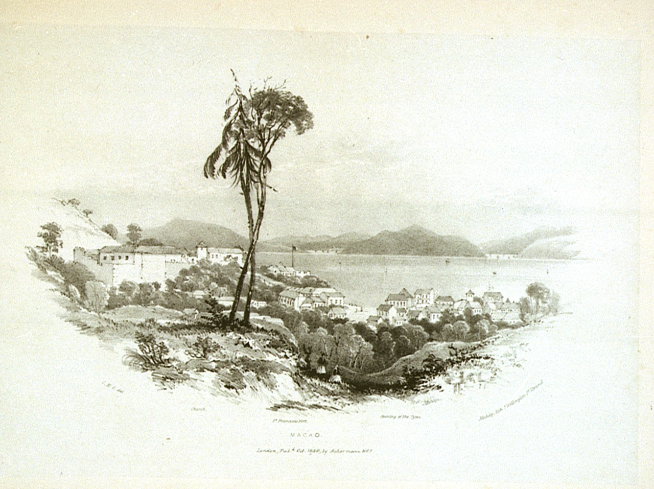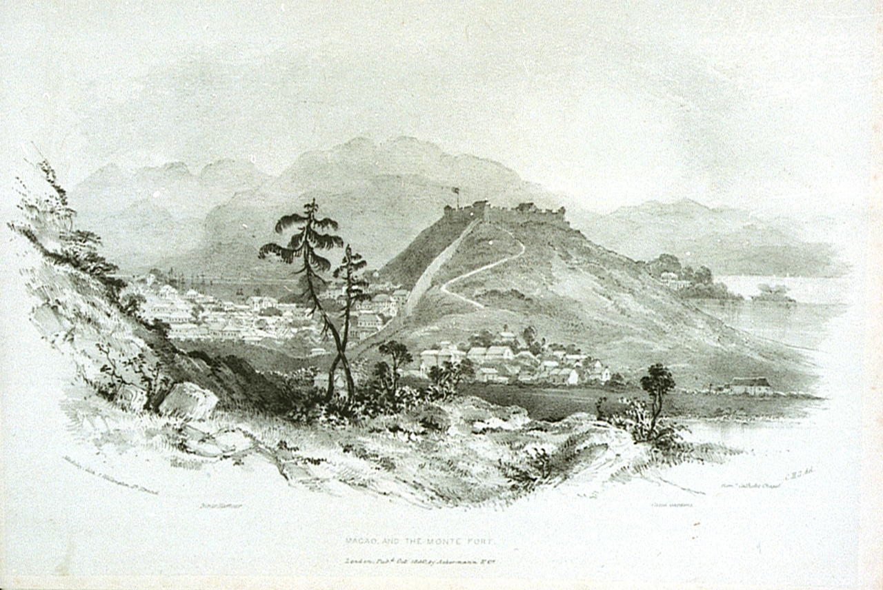 Macao and the Monte Fort, Inner harbour, Cassa Gardens, Roman Catholic chapel. Fifth illustration in pamphlet Six views of Singapore and Macao from drawings made on the spot in 1840. Bound in pamphlet with PAD0060-PAD0063, PAD0065-PAD0066.