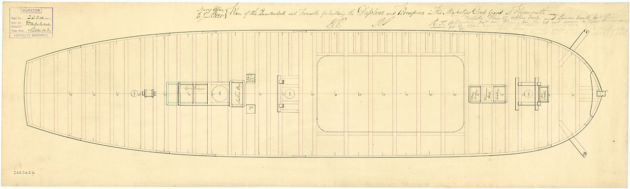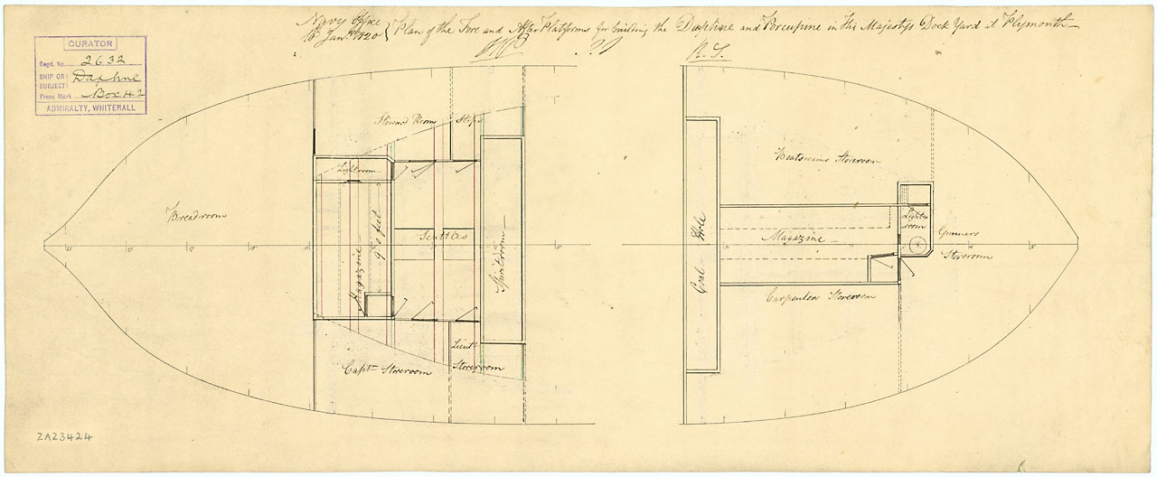Daphne (cancelled 1832) and Porcupine (cancelled 1832). Scale 1:48. Plan showing the fore & aft platforms with modifications for building Daphne (cancelled 1832) and Porcupine (cancelled 1832), both 28-gun, Sixth Rate Sloops, at Plymouth Dockyard. Ini